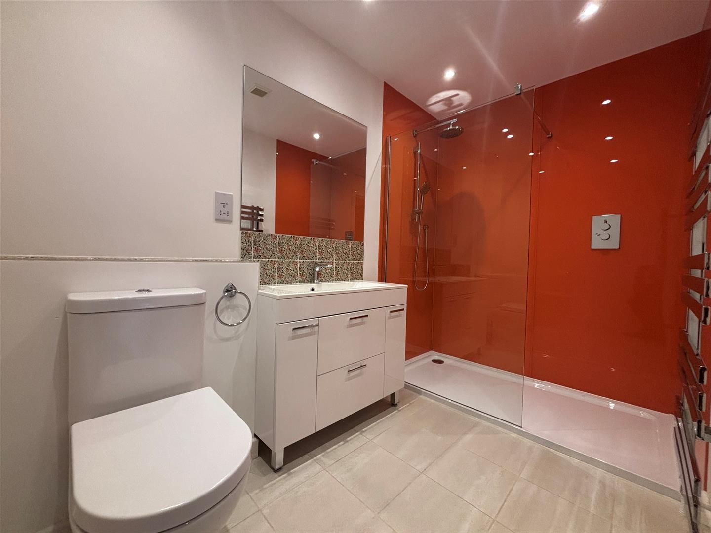 A smart and generous en suite with a good sized walk-in shower cubicle, vanity sink unit and WC.
