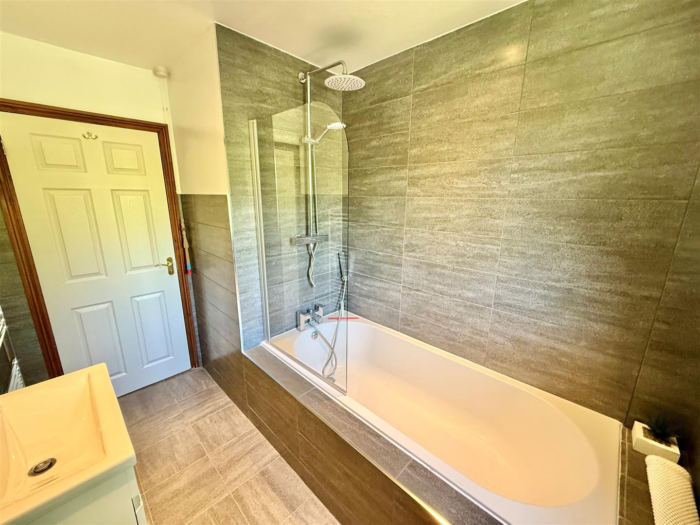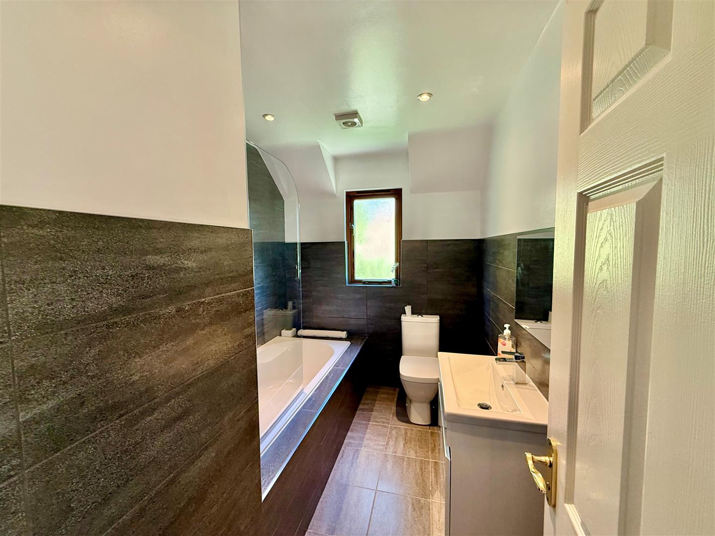 Comprising a bath with shower over, a WC and wash hand basin. Obscure window to side.