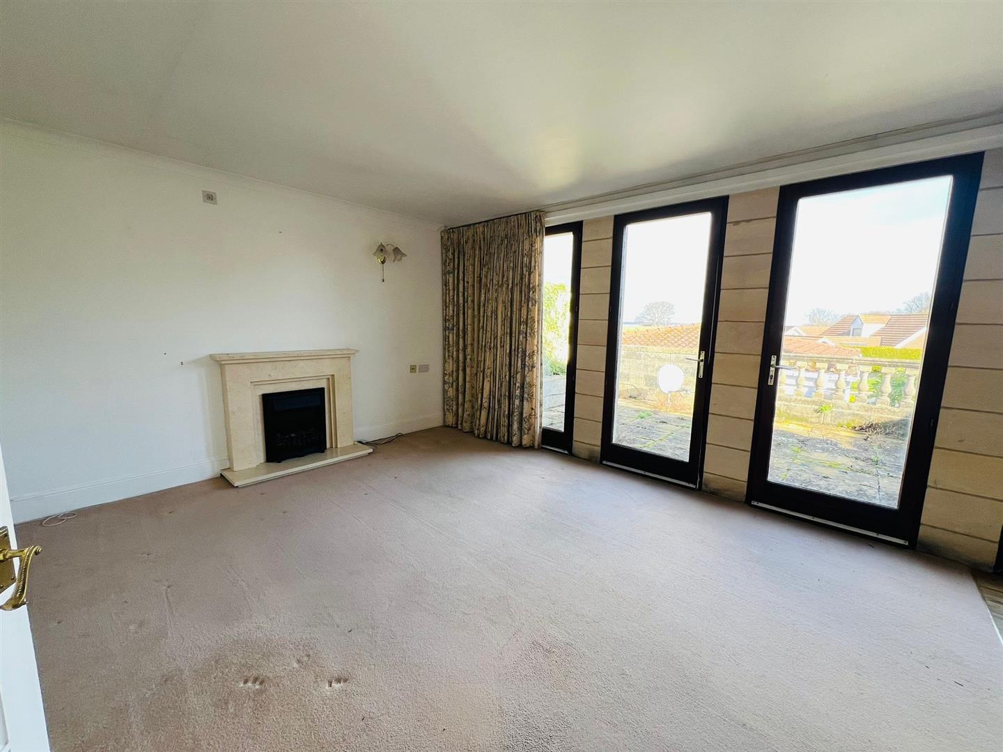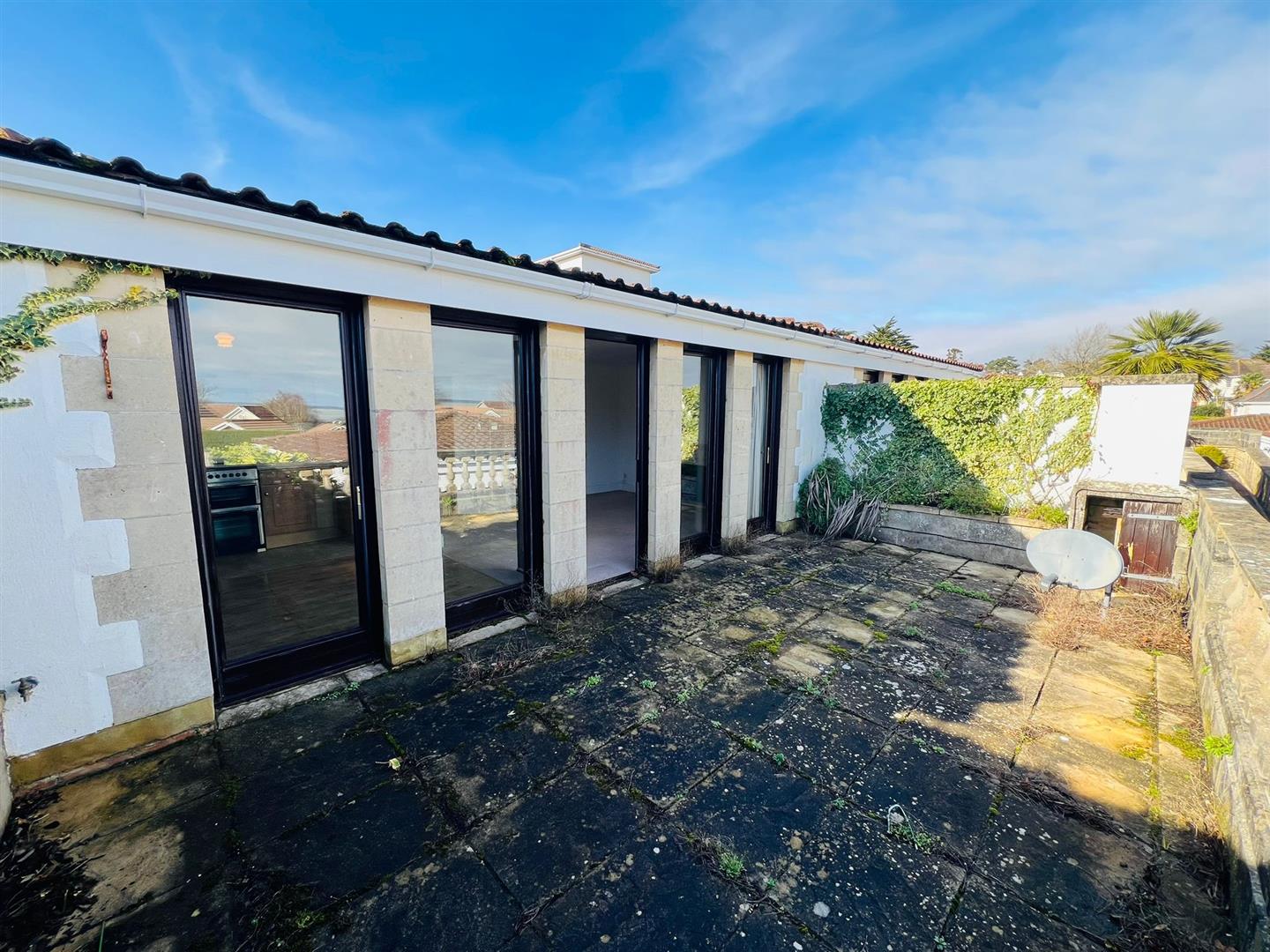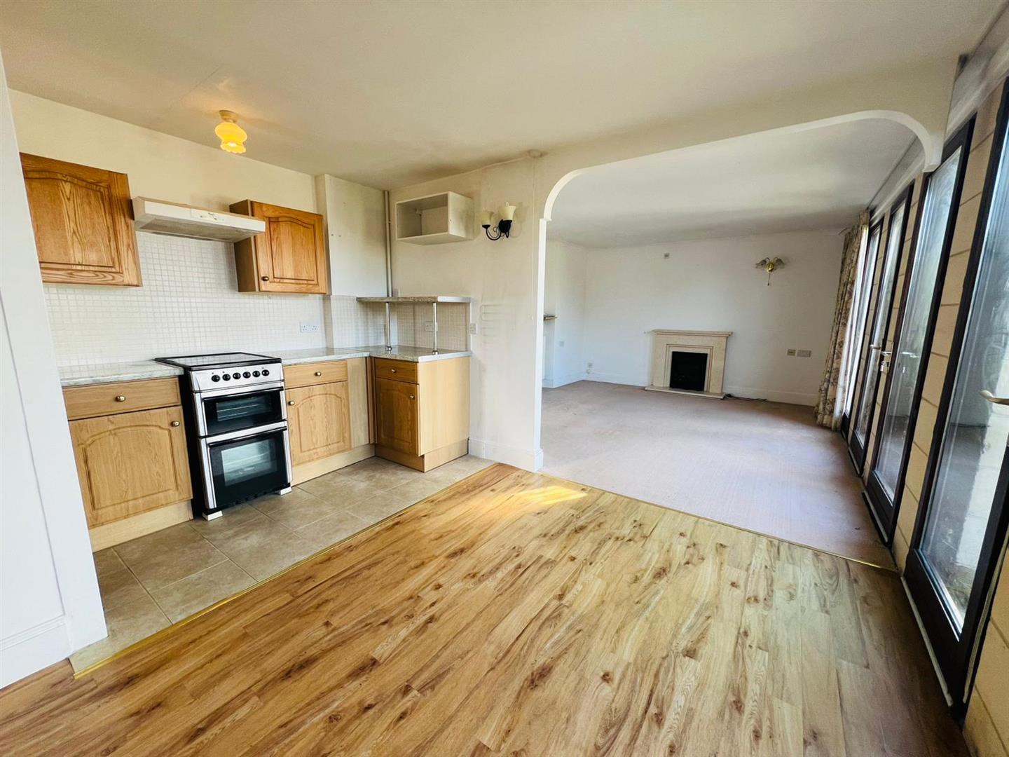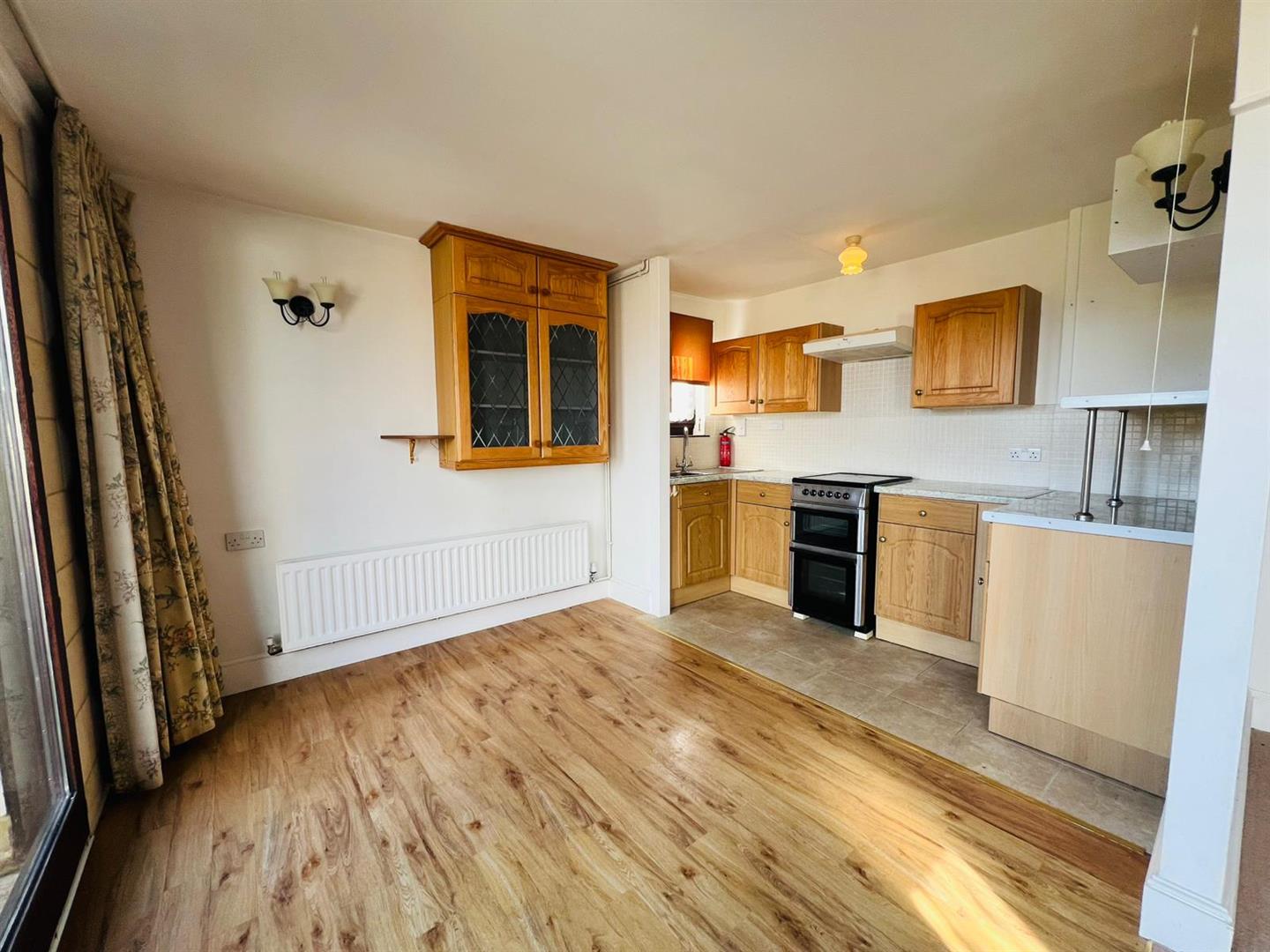 Good-sized light and airy room with a series of double-glazed doors making a ‘glass wall’ effect opening onto the large private paved terrace. The comfortable lounge area narrows to a dining area at one end with ample room for a dining table and chairs. With radiators, TV aerial point leading through to the KITCHEN/DINER that is fitted with a good range of base and wall units and drawers, sink and east facing window.