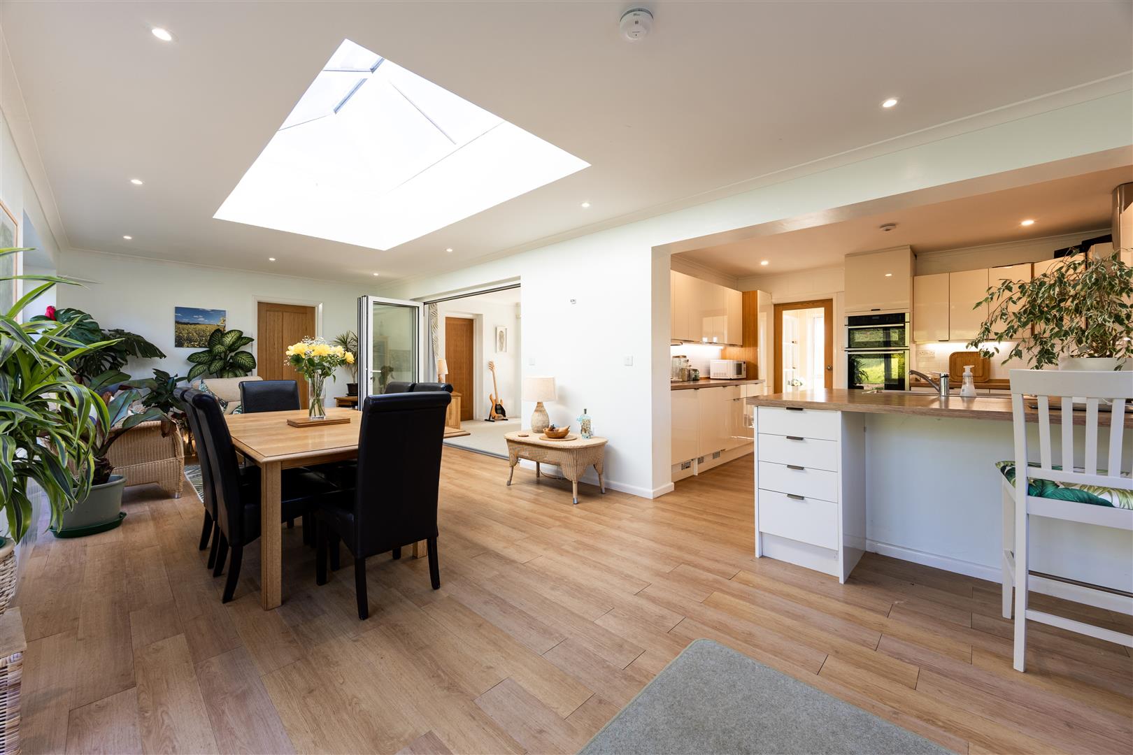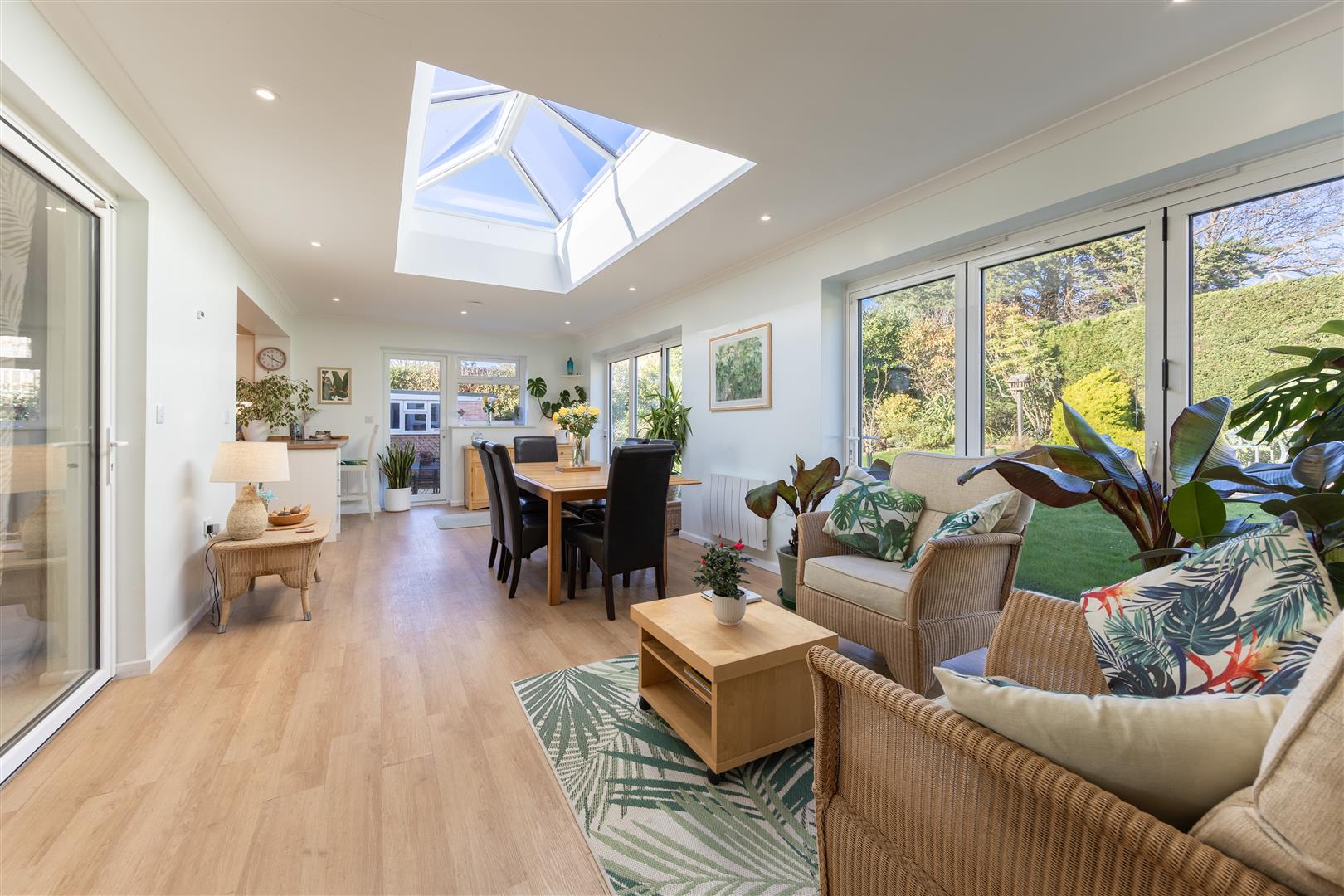 Woodlands enjoys a well-considered layout, with an attractive entrance hall leading to the principal rooms. The main sitting room benefits from a wood burner and there is plenty of natural light from its double aspect. A major feature to the property is the stunning kitchen/diner, which has created an attractive light and airy space to entertain and enjoy the views across the enclosed garden. The bespoke kitchen has a good range of wall and base units, and the dining area is large with a skylight window, flooding the room with masses of natural light. The large bi-fold doors in the garden room open completely to provide a seamless flow to the garden when entertaining. There is a raised hard terrace leading towards the formal lawn. The property has replacement bathrooms – all of which were done to a high standard.