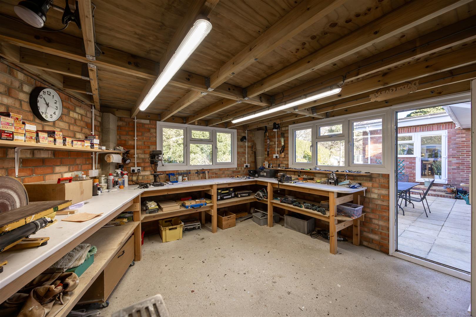 Outside The property enjoys a large plot with grounds that surround it. There is ample parking on the front drive and a ‘hidden’ parking area – a perfect space large enough to hide a motorhome, caravan, boat trailer or several vehicles. There is essentially parking for several cars and a large garage with electric door, attached to the southern side of the house. The garage has power and light and the extremely well-equipped recently extended workshop also has overhead fluorescent lighting, plenty of sockets and workbenches. The workshop is of brick construction and was granted planning permission at the same time as the kitchen/diner application. There is a beautiful private garden with a good range of hedging and mature shrubs. The garden has a summerhouse, a large shed and a green house.