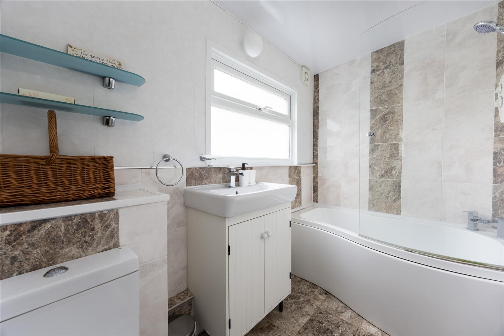 A high quality and natural suite including a bath, w/c and pedestal wash hand basin.