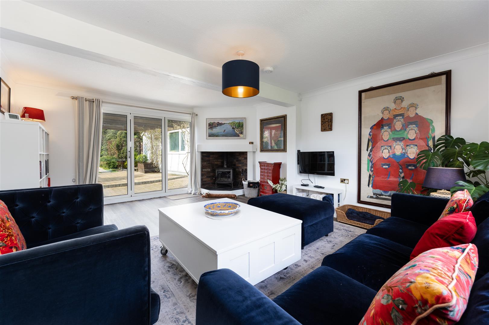 A large double aspect room benefitting from East and West facing windows. Double doors open out onto an attractive terrace. Wood burning stove in the corner with tiled surround.