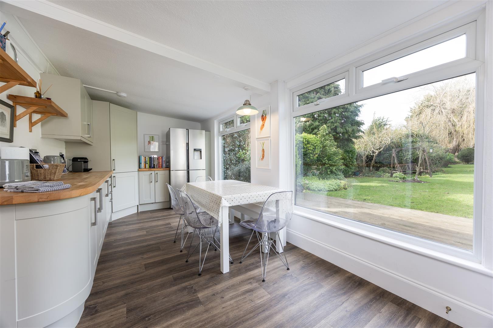 A stunning kitchen/dining room with high quality units sink with mixer taps and drainer to the side. To include fridge and washing machine. Pretty views over the wonderful and enclosed garden.